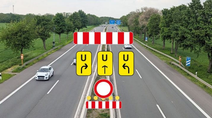 Eine weiträumige Umleitung über das Autobahnkreuz Monheim-Süd, die A542 und die A3 zum Autobahnkreuz Hilden beziehungsweise weiter auf die A46 zum Autobahndreieck Düsseldorf-Süd wird mit einem roten Punkt ausgeschildert.