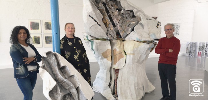 Razeea Lindner, Ulrike Schröter und Thomas Virnich (Foto v.l.) zeigen im Kunstraum Gewerbepark-Süd, Hofstraße 64, wie sie aus ihrem Material collageartig neue Bedeutungen kreieren.