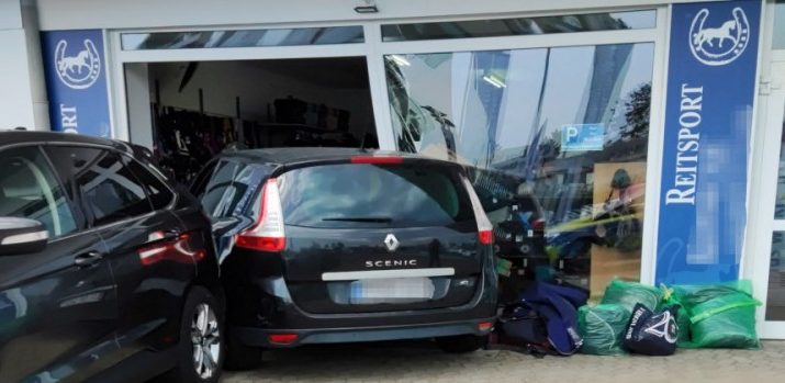 Schwerer Schaden an Auto und Schaufenster Am Mittwochnachmittag, 20. Juli, fuhr ein Düsseldorfer (50) mit seinem Renault Scenic in das Schaufenster eines Reitsportgeschäftes an