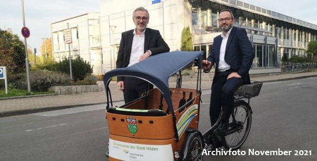 Nachfrage ergibt: Klimaschutz-Räder sind kaum im Einsatz ***Leitartikel*** Als die Stadt Hilden im Jahr 2021 zwei Lastenräder anschaffte (Archivfoto: Bürgermeister Claus Pommer, l., neben