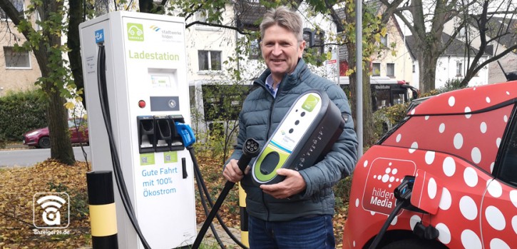 Zur Förderung der Elektromobilität betreiben die Stadtwerke Hilden bereits zehn Ladesäulen und eine Schnellladesäule an zentralen Orten oder Verkehrsknotenpunkten (Archivfoto oben: Jens Müller, Energieberater bei den Stadtwerken Hilden). In Wohngebieten gab es bisher kaum öffentliche Lademöglichkeiten. Deshalb werden seit letztem Herbst 19 zusätzliche Ladesäulen im gesamten Stadtgebiet aufgestellt und bis Ende Juli in Betrieb genommen.