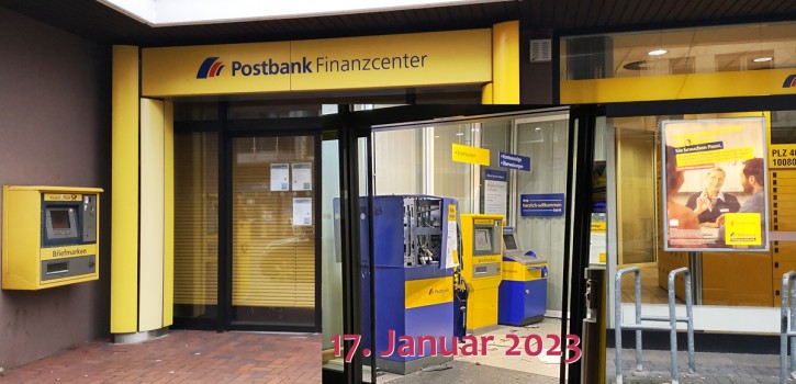 „Wir werden das Gerät Anfang Februar ersetzen“, erklärt uns Postbank-Mediensprecher Oliver Rittmaier. „Wir bitten um Verständnis, dass dies nach einem solchen Ereignis eine gewisse Zeit in Anspruch nimmt, da zuvor Schäden beseitigt und verschiedene Elektroarbeiten durchgeführt werden müssen.“