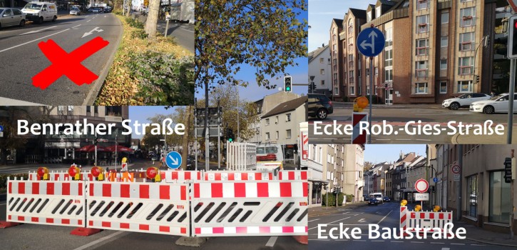 Folglich kann von der Robert-Gies-Straße aus nicht mehr rechts auf die Benrather Straße abgebogen werden; das gleiche gilt andersherum für Linksabbieger von der Hofstraße.