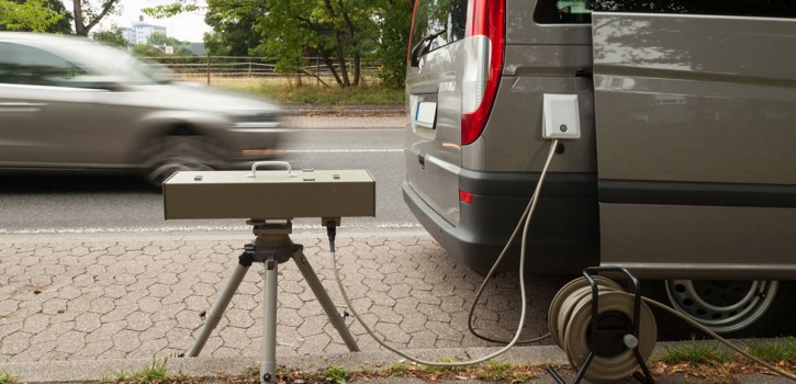 Das semistationäre Geschwindigkeitsmessgerät des Kreises Mettmann steht in der 11. Kalenderwoche am Westring in Hilden.