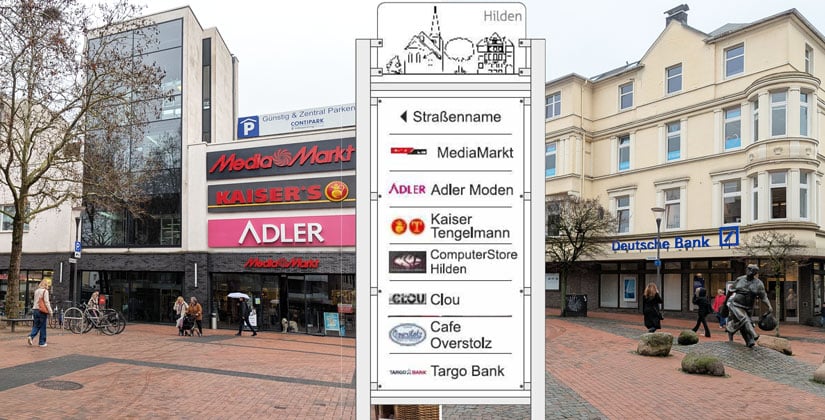 „Lage, Lage, Lage“, so spricht der Immobilienexperte, wenn es um die Attraktivität eines Geschäftsstandortes geht. Hildener Ladenbetreiber kennen das nur zu gut: Auf der Mittelstraße strömt der Laufkundschafts-Verkehr, während die Frequenz in den Seitenstraßen und im Nebenzentrum Warrington-Platz/Kronengarten eher schwächer ist. Die SPD-Ratsfraktion wollte bereits 2017 etwas gegen diesen Standort-Nachteil unternehmen und beantragte, dass Hinweistafeln auf die Geschäfte in den Seitenstraßen aufgestellt werden sollen. Die damalige Stadtmarketing Hilden GmbH und die Stadtverwaltung hatten daraufhin ein Konzept erarbeitet, das 2018 im Stadtentwicklungsausschuss zustimmend zur Kenntnis genommen wurde. Doch seitdem ist nichts passiert. Und nach jahrelangem Stillstand unternimmt das Citymanagement – quasi die Nachfolgeorganisation der Stadtmarketing GmbH – nun einen neuen Anlauf.