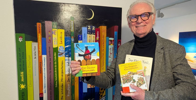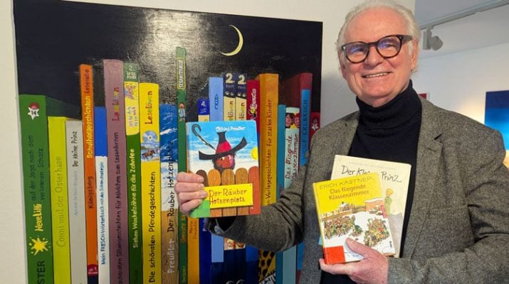 Zu sehen sind etwa liebevoll arrangierte Kinderbuchklassiker wie „Räuber Hotzenplotz“, „Der kleine Prinz“ oder „Das fliegende Klassenzimmer“, ordentlich aufgereiht im Bücheregal seiner Enkelin. Für die Ausstellung hat sich Kulturamtsleiterin Sandra Abend ein originelles Zusatz-Angebot einfallen lassen: Während Eltern die Ausstellung durchstreifen, können ihre Kinder in den Originalbüchern (Leihgabe der Stadtbibliothek für diese Ausstellung) blättern.