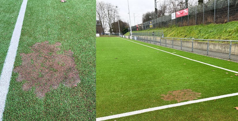Ebenso klaffen jetzt kleine Löcher auf dem Spielfeld Am Bandsbusch. Der Elfmeterpunkt auf einer Seite wurde gänzlich zerstört. Dort müssen die betroffenen Stellen entfernt und ausgetauscht werden, was zu Nahtstellen auf dem Kunstrasen führt.