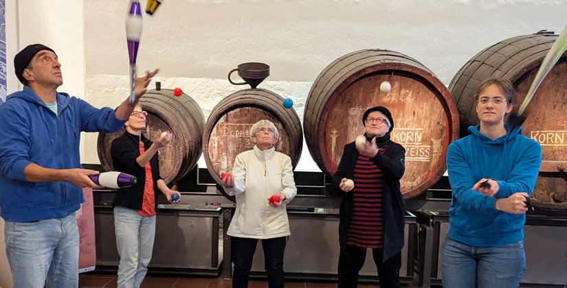 Ob Anfänger oder Wiedereinsteiger – willkommen sind alle, die Lust haben, Neues zu lernen und ihrem Geist etwas Gutes zu tun. Der Mobile Mitmachzirkus zeigt dabei, dass Jonglieren kein Zirkustrick für wenige ist, sondern ein wirkungsvolles und zugleich heiteres Training für Körper und Kopf.