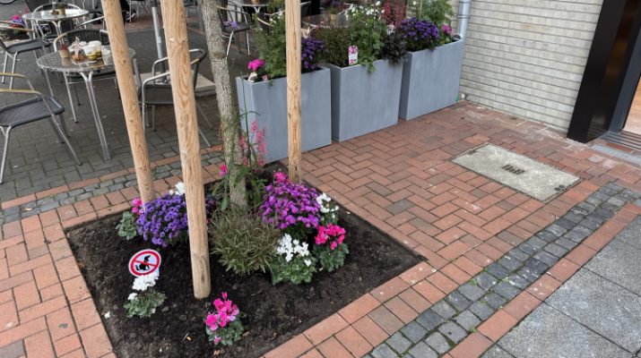Kaum waren die Pflanzen gesetzt, kam die Bäckerei Merzenich nebenan auf die Idee, es ihnen gleichzutun – und schon blüht auch dort das Baumbeet in kräftigen Farben. Nun erfreuen gleich drei blühende Inseln die Besucherinnen und Besucher der City.