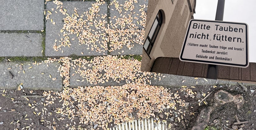 Vogelfutter liegt verstreut auf dem Boden, direkt neben den Parkbänken vor dem Rathaus-Center. Nur wenige Meter entfernt weist ein Schild unmissverständlich darauf hin, dass das Füttern von Tauben untersagt ist. Dennoch wird im öffentlichen Raum immer wieder Futter ausgelegt. Städte wie Hilden greifen deshalb zu klaren Verboten – aus mehreren Gründen.