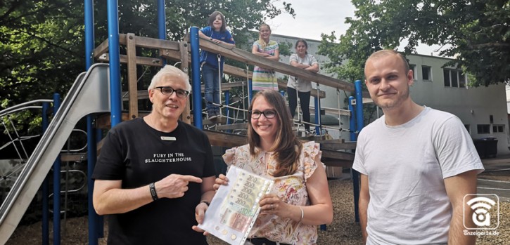Das Hildener Kinderparlament war beim Weltkindertag im September 2021 besonders eifrig: Beim Familienfest in Hilden beim Jugendtreff am Weidenweg unterstützten sie tatkräftig die Tombola und sammelten weitere Spenden. Am Ende kam eine stattliche Summe zusammen, die die Jugendförderung und die SPE Mühle auf 1.111 Euro aufrundete. Der Erlös ging nun an den Kinderschutzbund (Foto: Mike Dörflinger vom Team Spielmobil, l., und Timo Lang von der SPE Mühle bei der Übergabe an Geschäftsführerin Nadine Lichtenwimmer; im Hintergrund v.l.: Paul (10), Maylin (9) und Ester (11) vom Kinderparlament).