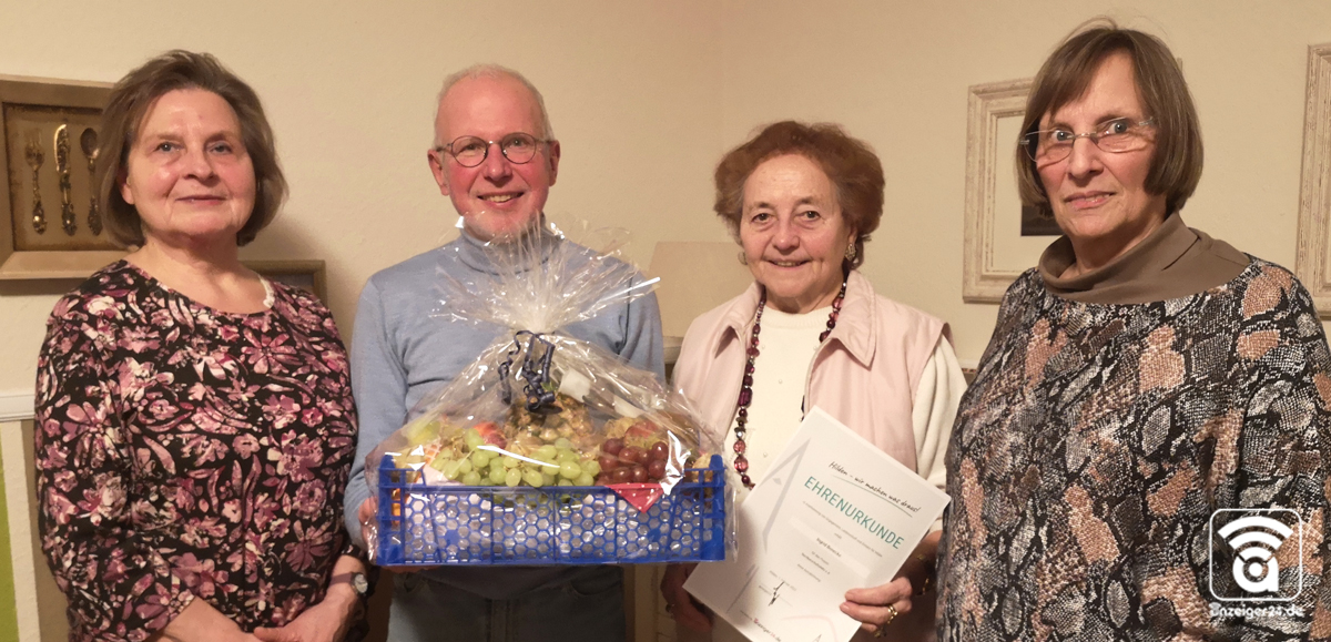Für diese Leistung hat anzeiger24.de nun der Vorsitzenden Ingrid Benecke (Foto 2.v.r. mit Edith Aust, l., Ulrich Scharrenberg und Hildegard Muckel) im Rahmen der Aktion „Hilden – wir machen was draus!“ eine Ehrenurkunde und eine prall gefüllte Obstkiste von Breidohr’s Frischecenter überreicht.