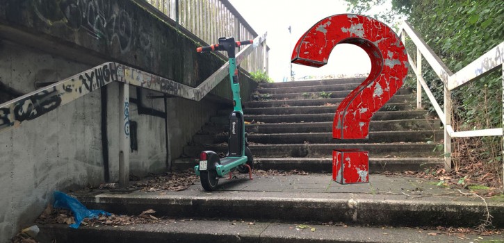 In allen Scootern sind GPS-Systeme verbaut, so dass Verleiher ihre Fahrzeuge orten können. Doch die Ortung stößt an Grenzen. Der Scooter auf dem Bild steht auf einem Treppenabsatz. War der Roller vorher zwei Meter weiter links oben auf dem Fußgängerweg abgestellt, kann das GPS eine „Verlegung“ auf die unmittelbar daneben liegende Treppe nicht feststellen. Und dann kann es schon mal ein paar Tage dauern, bis der Verleiher im Zuge eines routinemäßigen Austausches der Akkus auf das Gefährt stößt und dieses natürlich dann versetzt.